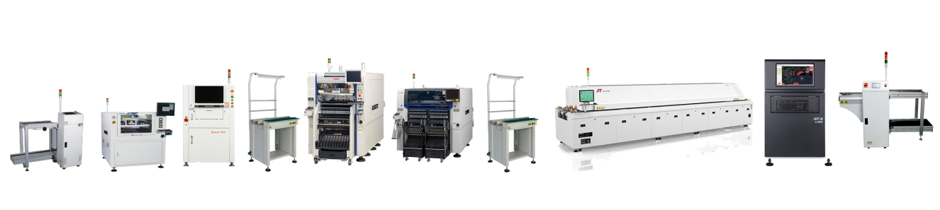 全自動(dòng)上板機(jī)→ 全自動(dòng)印刷機(jī)GKG  GSE→思泰克SPI →接駁臺(tái) →YSM40R→ YSM20→ 接駁臺(tái)→ 勁拓回流焊→ 矩子在線AOI → 下板機(jī)(從左→ 右)