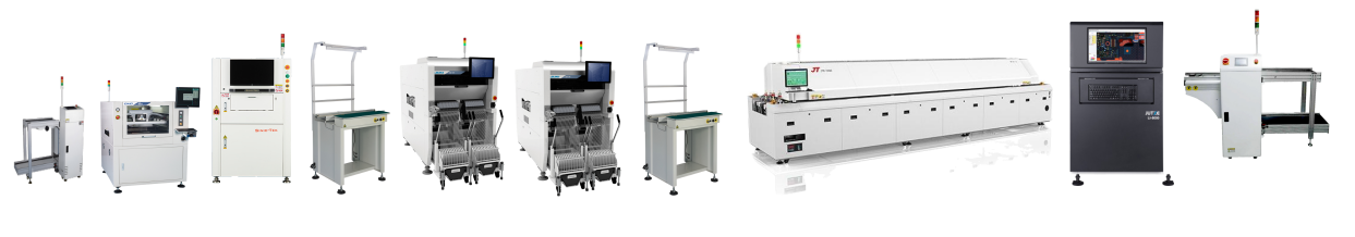 全自動上板機→ 全自動印刷機GKG  GSE→思泰克SPI →接駁臺 →RX-7→ RX-7→ 接駁臺→ 勁拓回流焊→ 矩子在線AOI → 下板機(從左→ 右)
