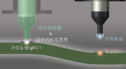 另外,獨(dú)家設(shè)計的低沖擊吸嘴還能防止錫膏塌陷以及元件開裂。 進(jìn)行補(bǔ)正,所以可以全速執(zhí)行極小元件的密間距貼裝
