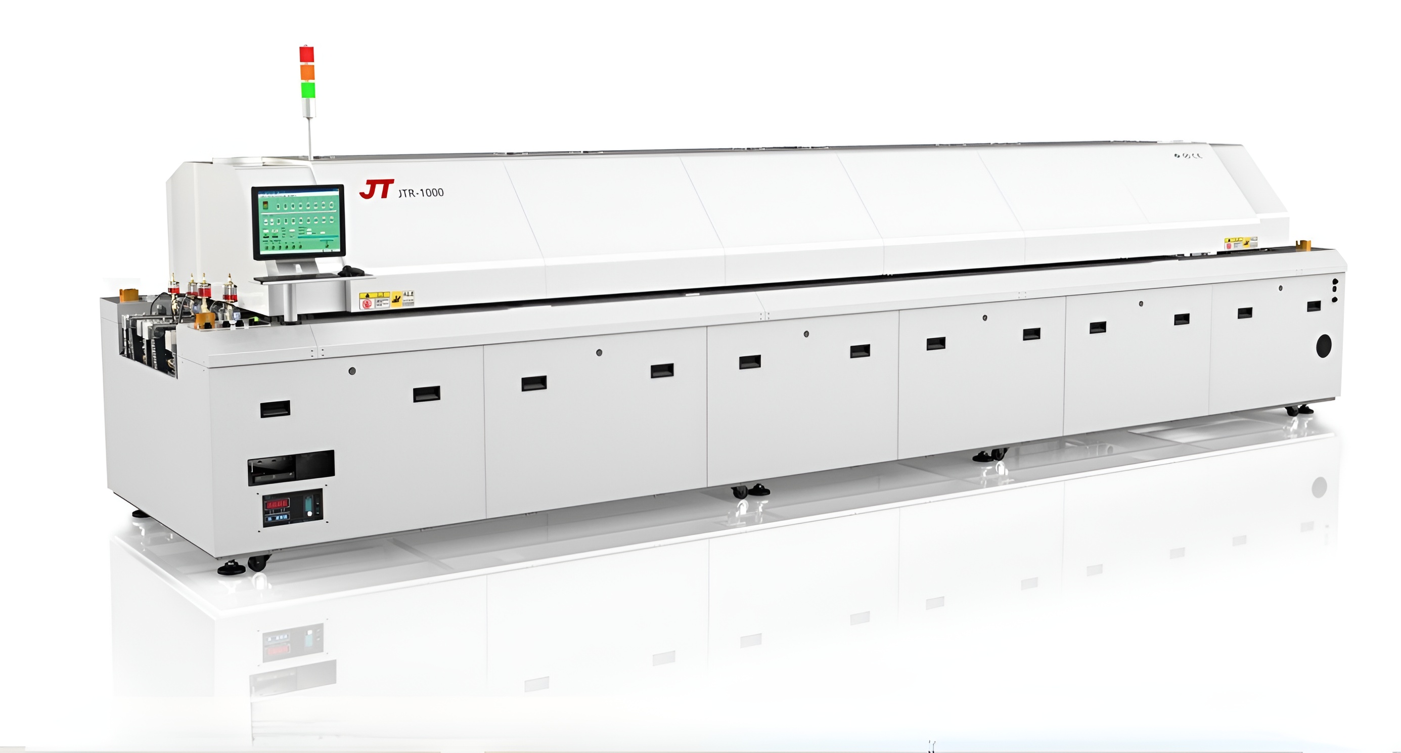 多層保溫爐膛設(shè)計,爐體外殼表面溫度降低10度至20度,有效降低工作環(huán)境溫度。 15%熱傳遞效率的提升從容應(yīng)對更復(fù)雜更大型焊接產(chǎn)品的無鉛工藝要求。 加強主吊臂確保導(dǎo)軌無橫向變形。 爐膛內(nèi)使用全面保護(hù)的密閉式設(shè)計,有效保護(hù)氮氣不易流失。 氮耗量低,在300-800ppm氧濃度環(huán)境下只在20-22m3/H。 機器上95%的材料可以循環(huán)再用。 新式冷卻結(jié)構(gòu)設(shè)計使大部分廢氣過濾或回收后返回爐內(nèi)。 工作爐體表面溫度低,熱損耗極小。